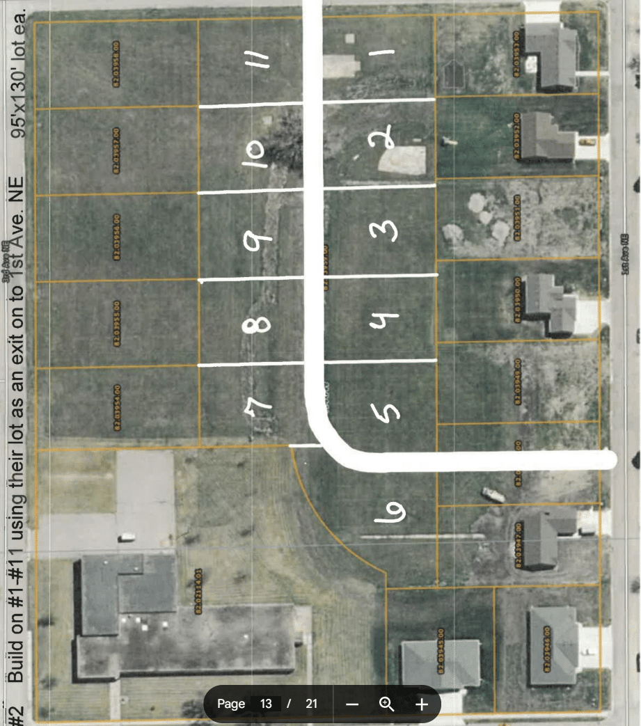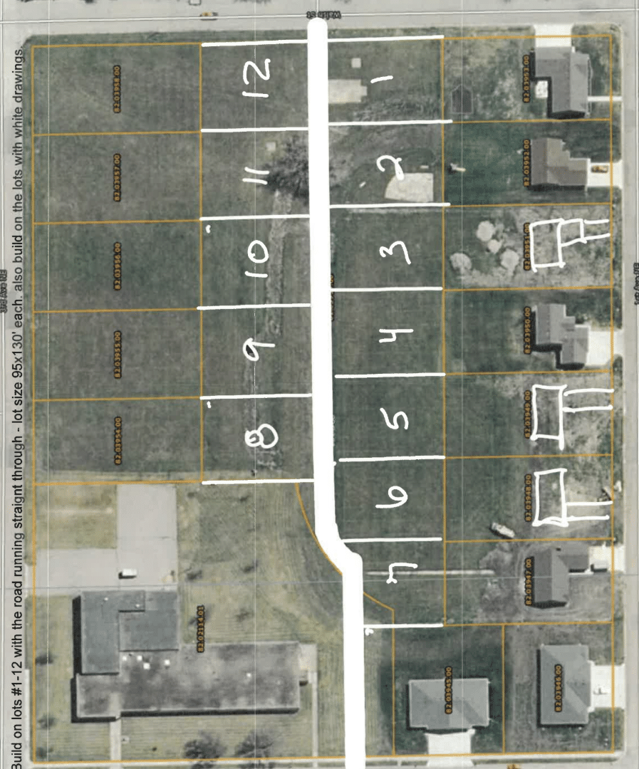 Concept 2 – A limited internal road with 1st Avenue NE access. Lots would be approximately 95’ x 130’ each.  This concept would reduce internal roadway length and infrastructure cost, and support smaller-scale housing clusters.