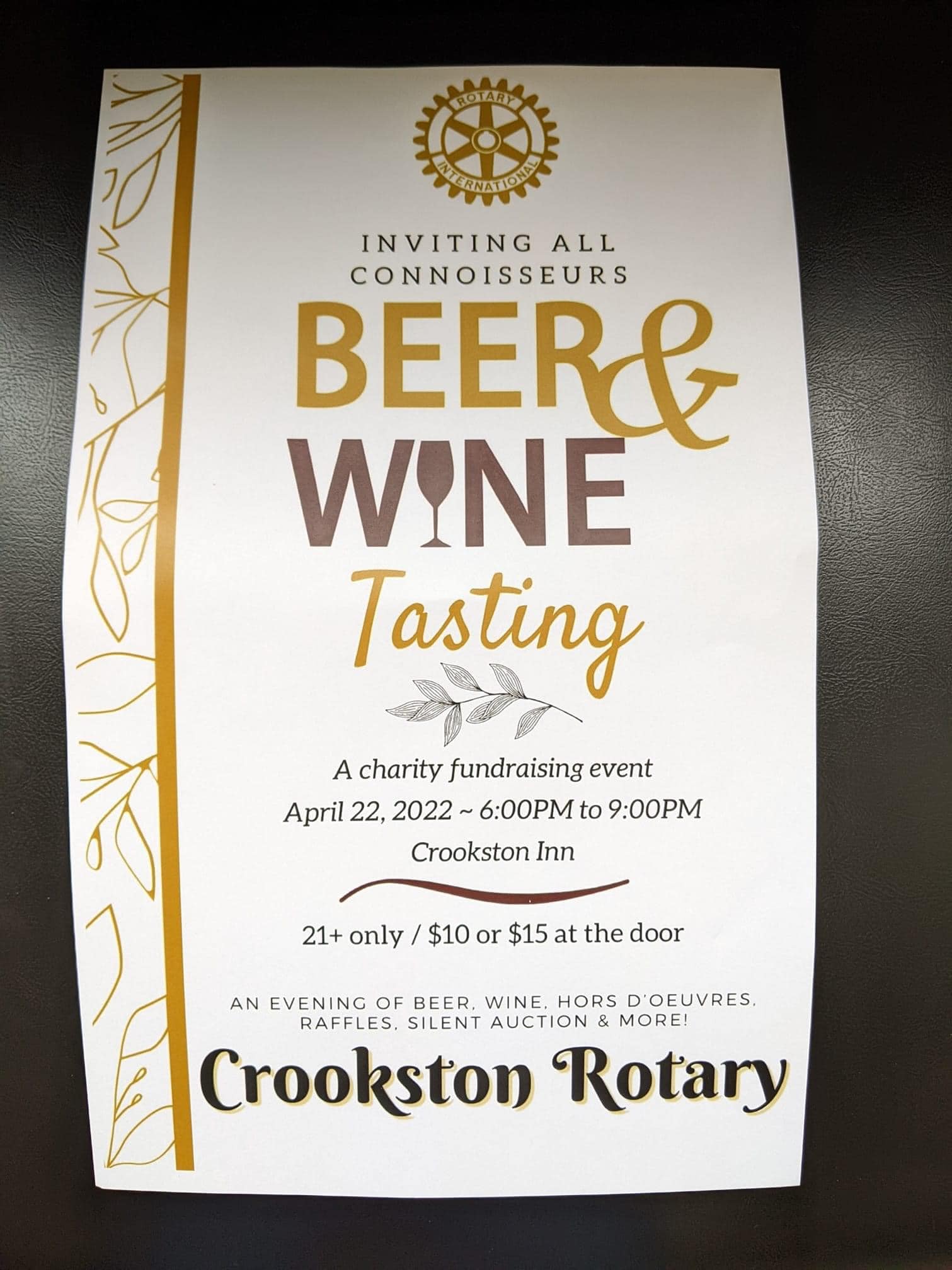 The Crookston Rotary Club will be holding its fifth annual Beer & Wine Tasting Charity Fundraiser at the Crookston Inn Ballroom on Friday, April 22, from 6:00 to 9:00 p.m. The event is open to anyone ages 21 and older, with tickets for the event costing $10 for pre-registration on their Facebook page and $15 at the door. All of the fundraiser’s funds go to various groups and businesses in the community.