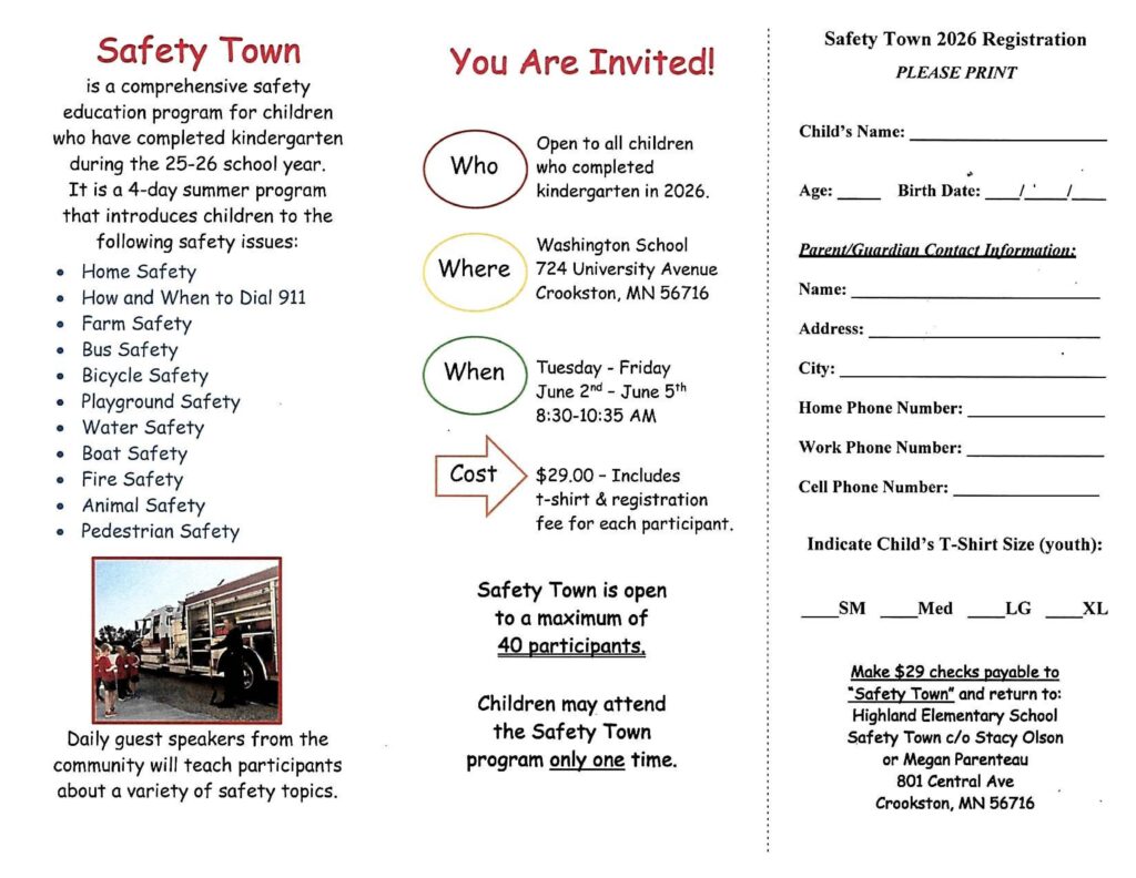 Crookston’s Annual Safety Town will be held from Tuesday, June 2, to Friday, June 5, at the Washington School gymnasium. Safety Town is for Crookston kids who will complete kindergarten this year. There are only 40 spots available, and registration ends on April 24.