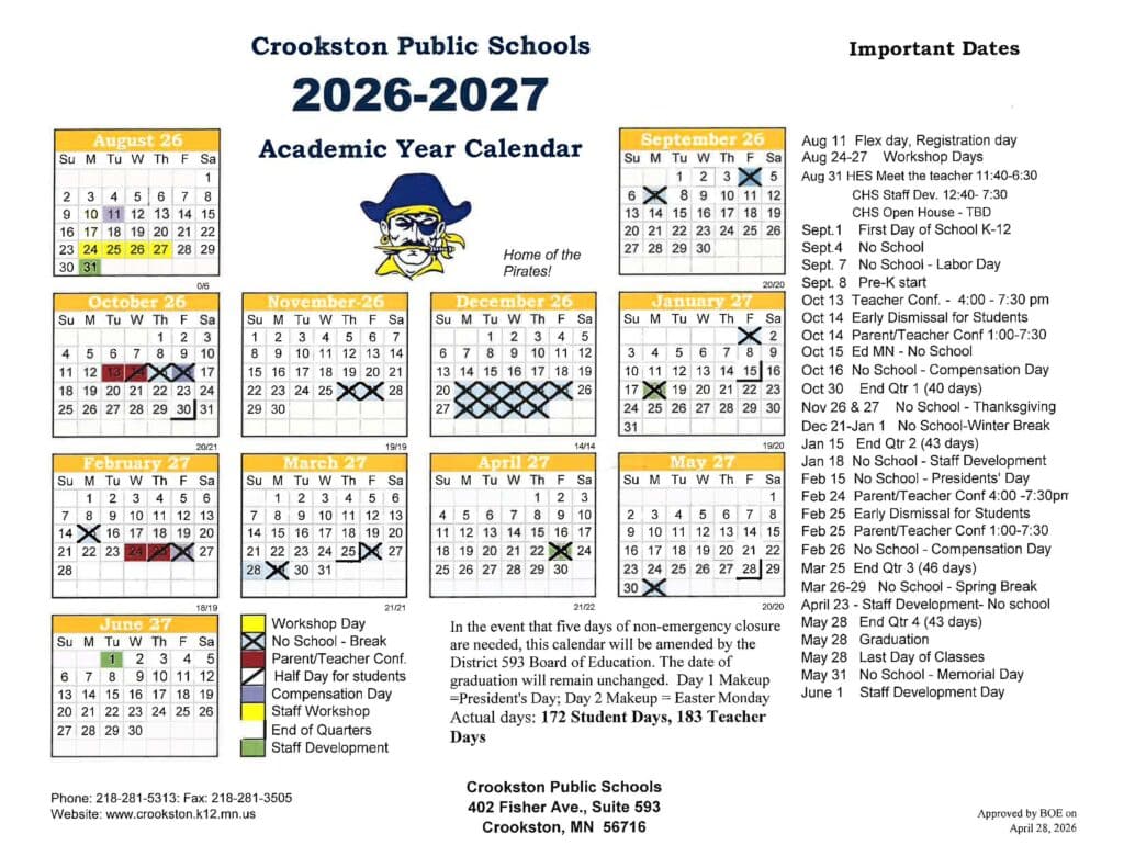 The Crookston School Board met on Tuesday evening for about 2.5 hours and approved the 2026-27 school year calendar and non-renewals. The meeting recap is below.
