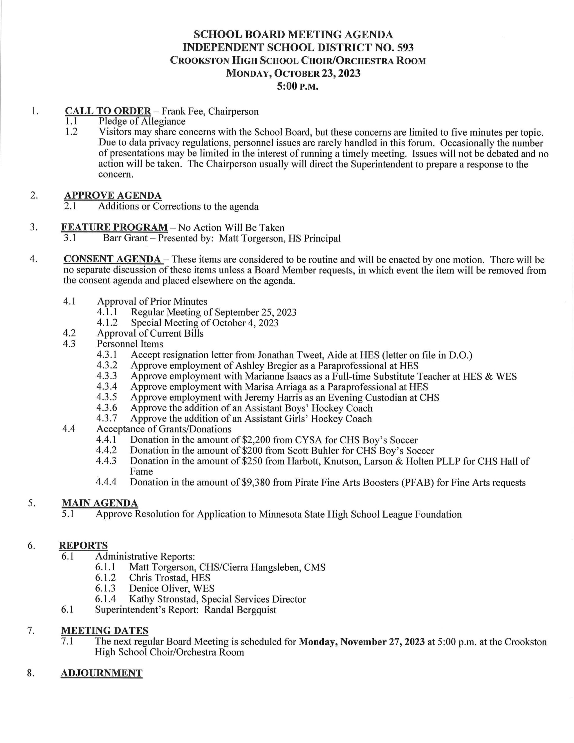 The board will be asked to add an assistant Boys Hockey and Girls Hockey coach, to accept a $2,200 donation from the Crookston Youth Soccer Association, and a $200 donation from Scott Buhler to the Boys Soccer program. They will also be asked to accept a $250 donation from Harbott, Knutson, Larson, and Holten PLLP for the Crookston High School Hall of Fame, and a donation of $9,380 from the Pirate Fine Arts Boosters (PFAB).