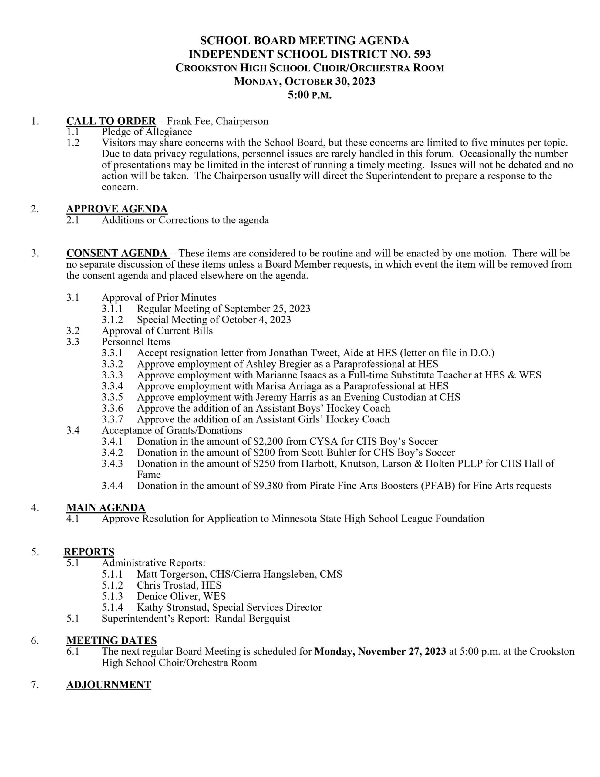 The Crookston School Board will meet on Monday, October 30 at 5:00 p.m. in the Crookston High School Choir/Orchestra room. The board met on October 23, but only three of the six board members were able to make it so they postponed the meeting to October 30. The meeting agenda is below.