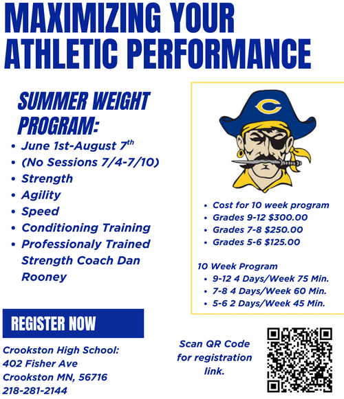 The Crookston summer strength and conditioning sessions are part of a comprehensive training program designed to improve the long-term athletic development of all participants. Led by a nationally certified strength and conditioning coach, this program will enhance speed, agility, power, strength, mobility, and endurance. Sessions will be capped at 25 participants per session. Additional time slots will be opened if the number exceeds the max per age group. Age Groups will be based on the 2026-2027 school year.