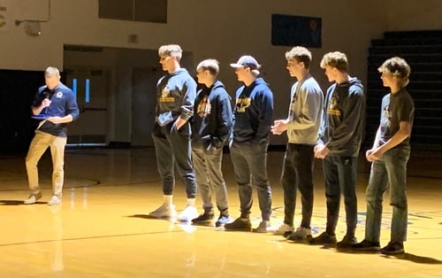 The Crookston High School student body and some members of the public attended the celebration with the lights off and the wrestling light was on in the middle of the gym floor. Pirate Wrestling Coach Wes Hanson introduced the six Pirate wrestlers, Evin Trudeau, Ethan Bowman, Carter Coauette, Hunter Knutson, and then introduced the two medalists.