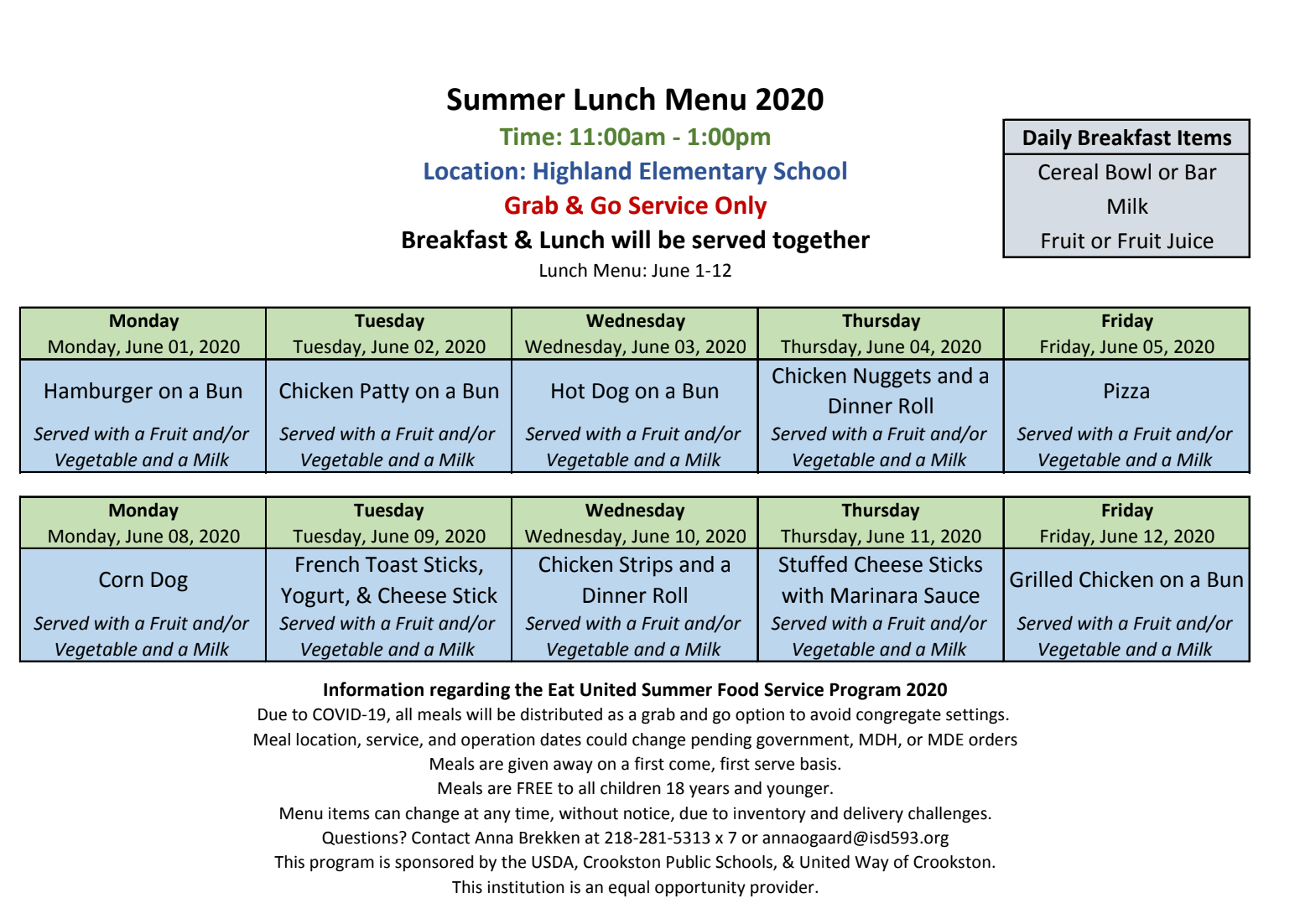 CROOKSTON SUMMER FOOD SERVICE MEAL SCHEDULE June 3, 2020   news   Crookston Food Service program, Crookston Public Schools, news Below is the meal schedule for the first two weeks of the Crookston School District’s summer food program – Share: Tags: Crookston Food Service program, Crookston Public Schools, news
