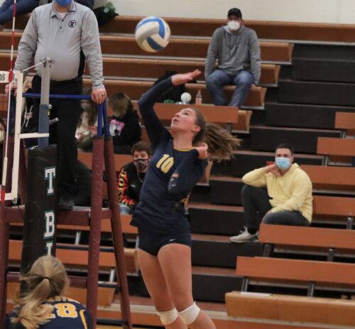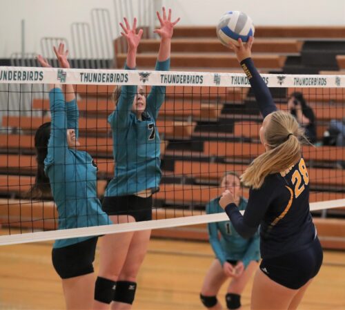 Mahnomen-Waubun had a strong start for an 8-3 lead, and after the Pirates had a point after a Sundeen kill, the Thunderbirds answered with five straight points for a 13-4 lead.  Crookston wasn’t able to recover, and Mahnomen-Waubun cruised to a 25-12 victory to win the match 3-1. “I think we might have run out of gas,” said Coach Stopa. “We had another slow start, and this time we couldn’t recover.”