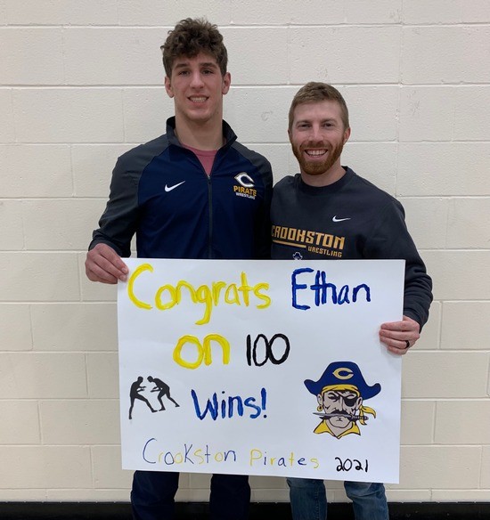 Crookston’s Ethan Boll stopped the ACGC winning streak with a win by pin in the second period. The win was Boll’s 100th career victory. “Ethan wrestled a nice match and had a beautiful takedown before getting the pin,” said Coach Hanson. “Ethan started wrestling at 138 pounds and to get 100 wins as a sophomore is a pretty impressive feat.”