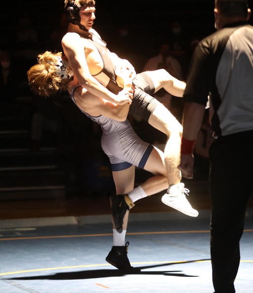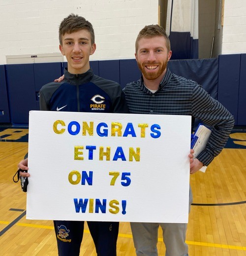 It was an anti-climactic 75th career victory for Ethan Bowman as he won his match at 126 pounds by a forfeit. “I was hoping they would put somebody out there,” said Coach Hanson. “He has a lot of wins as they are adding up.”