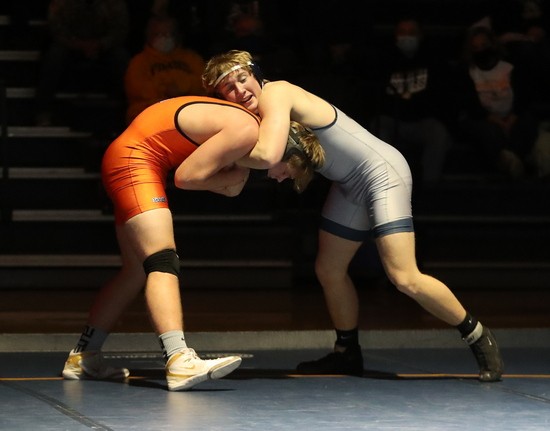 Ethan Bowman followed with a big win by pin in the first period over Garret Eiynk.  It looked look Eiynk had Bowman on his back and close to a pin, but Ethan rolled right through and countered with a cradle for the pin in just over a minute to give the Pirates a 16-3 lead. “That was a huge win for Ethan,” said Coach Hanson. “It was a great night for him and he beat a kid that has been in the state tournament a couple of times, so that was a nice win.”