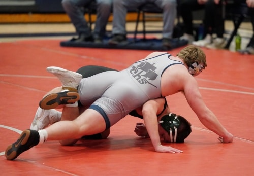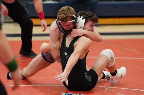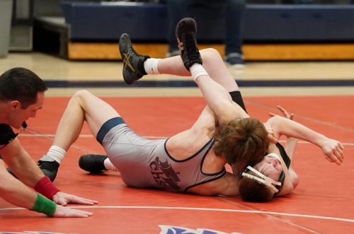 Hunter Knutson got the Pirates back on the winning track with an impressive performance.  He took a 2-0 lead with a strong takedown and controlled the rest of the period.  In the second period there was no scoring and in the third, Hunter started with an escape for a 3-0 lead and added a takedown as he won the match 5-0 to bring the Pirates within a 28-24 lead. “Hunter had a great match and worked hard out there,” said Coach Hanson. “Hunter was grinding and had a nice win.”