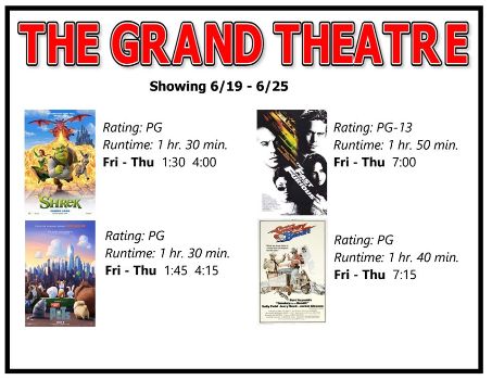 The Grand will reopen Friday afternoon with showtimes at 1:30 p.m., 1:45 p.m., 4:00 p.m., 4:15 p.m., 7:00 p.m., and 7:15 p.m. “We’re going to be bringing in older movies for the first month or so we’re open,” said Brorby. “We’re picking a bunch of great older movies that everyone seems to enjoy, fun movies to see in the theatre. We’re starting with showing the Secret Life of Pets and Shrek during the day. And then, at night for the 7 p.m. shows we’re showing the original Fast & Furious, and Smokey and the Bandit. Each week we’re going to be bringing in a variety of movies. We’re going to be charging $3 (for tickets) until we start bringing in new movies. That’s hopefully looking like the middle of July new movies will start coming out.”