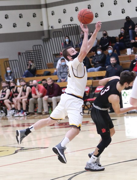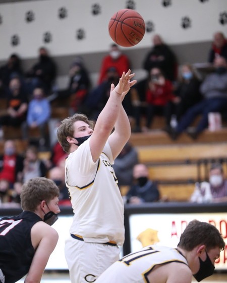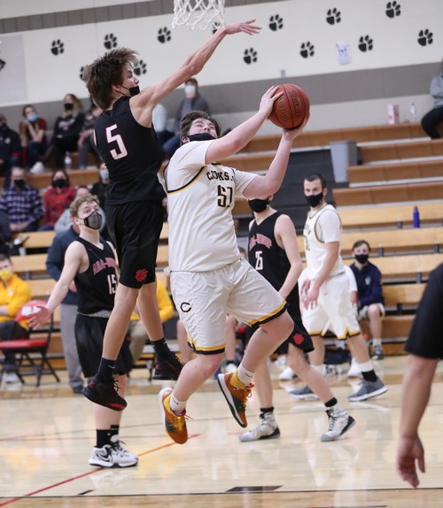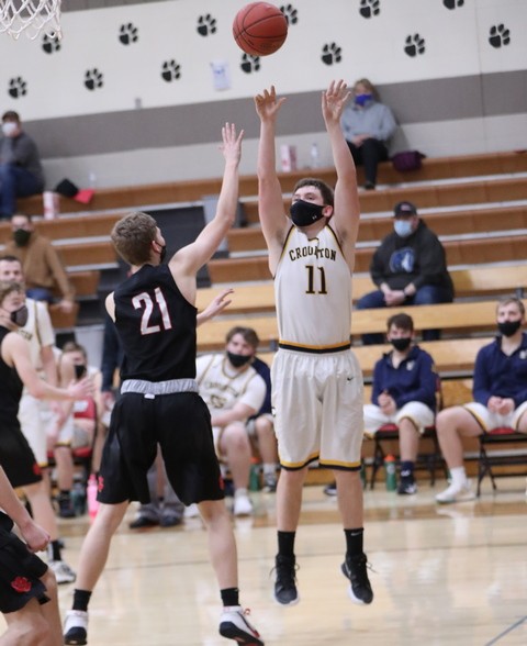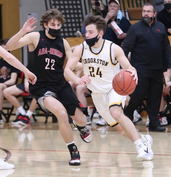 Crookston jumped out to a 7-3 lead with four points from Jack Garmen and three points from Easton Tangquist. After a Cougar three-pointer, Tangquist had back-to-back baskets for an 11-6 lead. Ada-Borup/West answered with a run of their own to tie the game at 12 with 11:27 left in the half. Tangquist stopped the run with a basket and Jacob Miller followed with a three-pointer to give the Pirates a 17-12 lead. A few minutes later, Crookston led 24-22 when Jacob Hesby made back-to-back three-pointers to give the Pirates a 30-22 lead with less than four minutes to go and they took a 38-27 lead into halftime. “Jacob was shooting well for us and those were some big shots to expand the lead. Jacob was shooting well before he had to quarantine for a week and a half and is starting to get the shot back so that is good to see,” said Pirate Coach Greg Garmen. “We had a pretty good first half and we were making some shots. We had Easton, Jack, Miller, and Hesby all make threes in the half so that was good.”