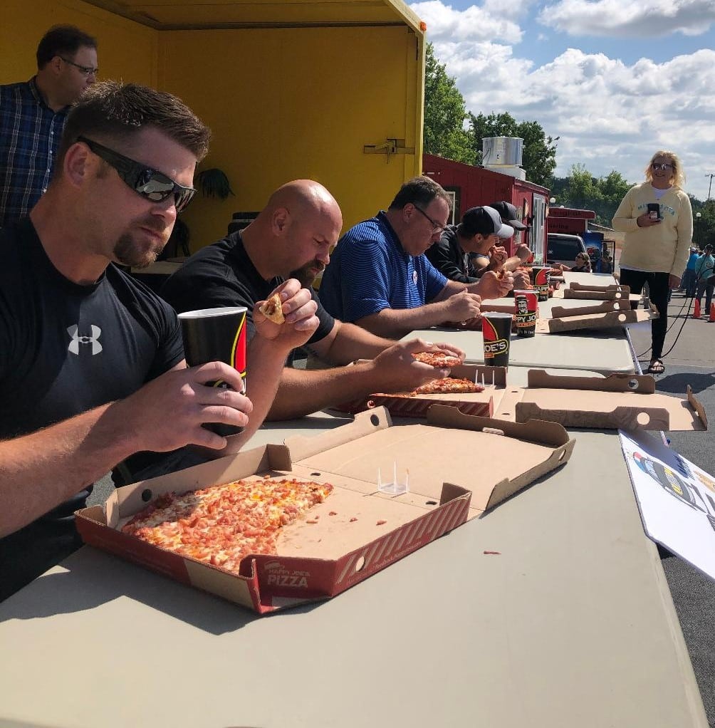 Erdman ate a large Happy Joes Pizza in 10:19! Erdman won a free medium pizza once a month for the next year from Happy Joes for his accomplishment.