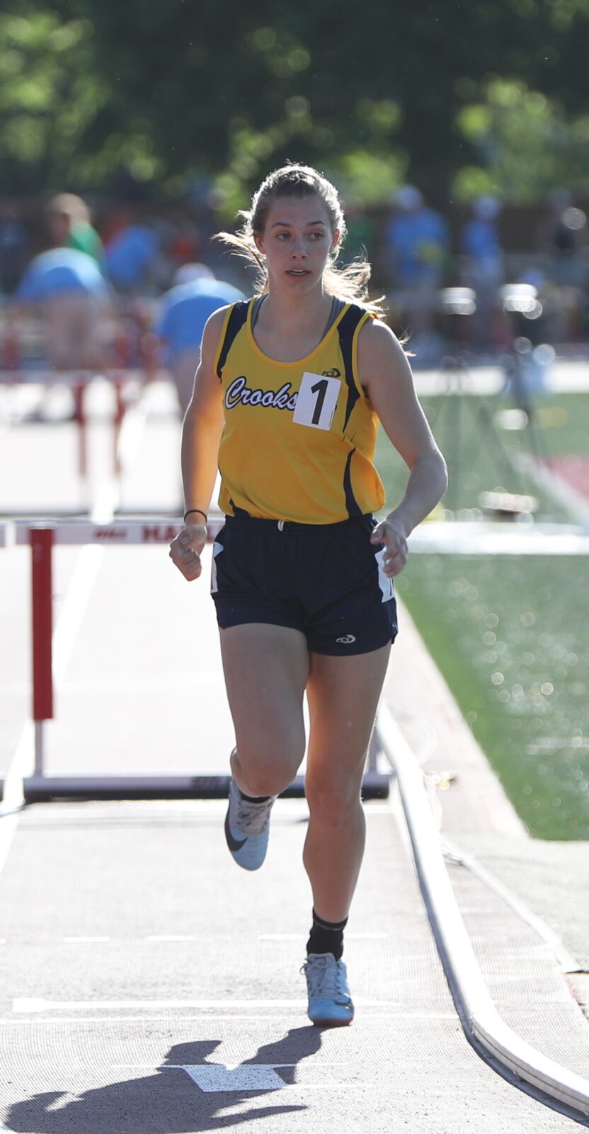 Jaylen Struck-Schmitz of Belle Plaine won the event in 43.11 second followed by Shaina Zinter from Concordia Academy-Roseville who finished in 43.43 seconds. In the finals, Emma Borowicz ran from lane one and finished with a time of 47.30 seconds. “I was in lane one, and the girl in lane two, we started and right away I was caught behind,” said Borowicz. “Overall, it was tiring. Everyone was really good. I got to the last 100 (meters) and I think there were only two girls that were behind me, but it was good. It still felt nice.” Borowicz noted that she’ll be looking to improve with two more years still to compete for Crookston, “I have time to improve. I can work a little harder next year and then hopefully come back and have a faster time. There’s a lot of really fast people and there’s a lot more that I can do. It’s been a good year It’s definitely been one of the better ones learning hurdles, which is something I’ve never really done before, so getting to come down here was good.” Crookston Pirate girl’s track and field head coach Amy Boll was equally pleased with her sophomore’s performance, “I thought she had a really good start to the hurdles,” said Boll. “Making it to the podium was fantastic. She took off and had a great start to the beginning. She attacked the first hurdle and then she came around the straightaway, and I thought she looked pretty good coming over the hurdles. I’m very happy with how she performed today and how she did. She’s going to get stronger and faster. I’m just very proud to be a part of this and watch Emma be able to perform. I can’t wait to tell her ‘congratulations.'”