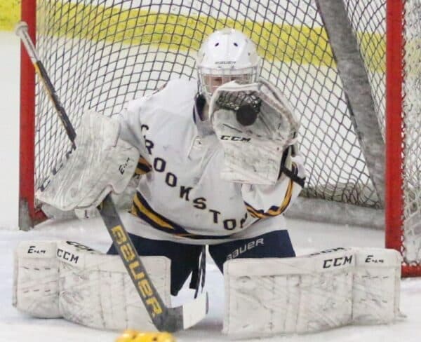 Sophomore Addie Fee scored four goals for the first time in her career, and Sophomore Kambelle Freije had 17 saves for her fourth shutout of the year to lead the Crookston Pirates to a 5-0 win over the Thief River Falls Prowlers in a Section 8A Tournament semi-final game to send them to the Section 8A Championship game on Thursday against the #1 ranked Warroad Warriors in Warroad. Warroad defeated the East Grand Forks Green Wave 9-2 in the first game tonight to punch their ticket to the final. “This is a game where the girls did exactly what we wanted to do,” said Crookston head coach Emily Meyer, “we came out flying and played with a purpose for all three periods.”