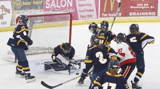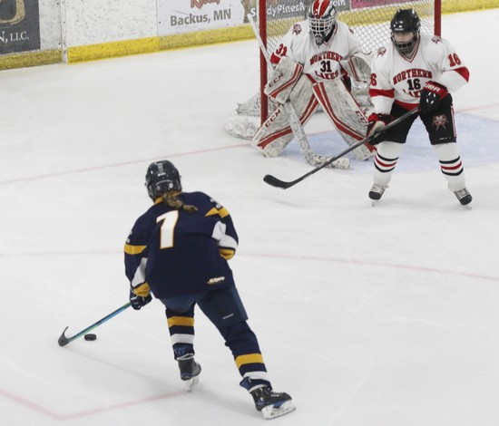 Crookston got off to a quick start when the Pirates leading goal scorer, Freshman Reese Swanson keeping a clearing pass from Northern Lakes in the zone and swooped in toward the Lightning’s goal and snuck it past the Northern Lakes goalie for a 1-0 lead. “That is big to get an early first goal,” said Pirate head coach Tim Moe, “when you get an early score like that, it gives you a little more lift playing on the road. Reese made a nice play and went straight for the net and made a nice shot.” Both teams had some chances as the period went along, but both goaltenders were solid. “I thought our speed was outstanding in the period and the entire game,” said Moe, “we were winning the races to the puck, and again it was a good way to start. The Pirates added another goal with two and a half minutes left in the period as the Pirates applied great pressure and then from the point, passing from Jenna Seaver to Rylee Solheim and a scramble in front and sophomore Grace Fischer was able to get to the loose puck and drive it in for a 2-0 lead, and that is the way the period would end. “That was nice to see the third line get the goal there,” said Moe, “they really work hard in the games and practices, and to see Grace able to get that rebound past was great and really a great time before we went into the locker room with a 2-0 lead.”