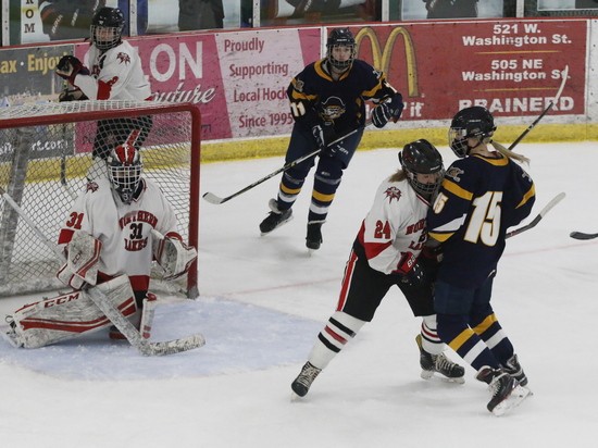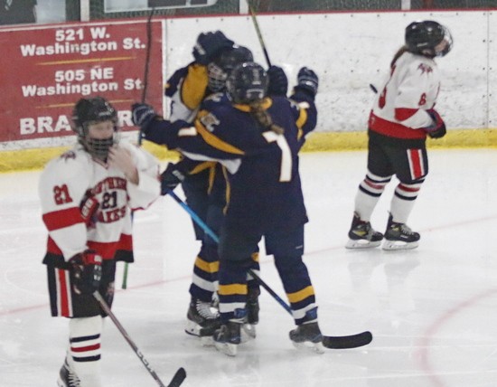 Talk about scoring quickly. It took just:28 seconds, and Fee scored her first goal, grabbing a rebound from a Mackenzie Epema shot, and the rebound bounced to Fee, who was about five feet just a little to the right of the Northern Lakes goal and quickly shot before the goalie could move over and the Pirates led 3-0. “I told Addie after the Bemidji game on Tuesday when she scores her first goal, that would open the flood gates for her,” said Moe, “she’s been a good scorer through the youth programs and had a quick shot there and in the right position.” Northern Lakes, a coop of many schools, mainly Pequot Lakes and Crosby-Ironton, but also Aitkin, Pine River-Backus, would score their only goal just over six minutes into the period as the Pirates did get caught up. The Lightning’s Riley Fogarty was given a nice pass from Elizabeth Peterson at the Pirate blue line, and she skated in and had an open shot from the circle to the right of Magsam and was able to beat her on a nicely placed shot to make it a 3-1 game. “We don’t want to take away the aggressiveness of our team,” said Moe, “but we have to be more cognizant of where everybody is on the ice and not get caught up in those situations.” Just over two minutes later, Fee would strike again for her third goal in the last three games, as Nora Peterson, who just came unto the ice, got the puck in front, and Fee was able to get the puck and again snapped off a quick and accurate shot to make it a 4-1 game. “Catherine Tiedemann, who had quite a night on Thursday with three goals against Bemidji, was not here tonight as she is attending a cousin’s wedding,” said Moe, “so it was nice to see someone pick up the scoring for her and Addie seems to be getting more comfortable as we go along and hopefully it will continue for her.”