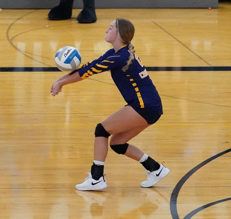 The Pirates got the first point with a Perreault kill before the Falcons got the following four points, highlighted by a big Marin Roragen kill. Perreault ended the run with another kill, but Fertile-Beltrami kept up the pressure with three aces from Jordyn Berhow, pushing their lead to 8-2 before a Crookston timeout. After the timeout, Berhow added a fourth ace and two more serves that Crookston could not return, eventually leading to a 14-3 lead. “The girls shut down and couldn’t get anything going,” said Pirate Coach Engelstad. Crookston made a mini-run with a Kressin ace and a kill from Hannah Loraas, but the Falcons were too strong in the second set, finishing strong on a kill from Ranz and a block by Erickson to win the set 25-9. “We played the way we are capable,” said Falcon Coach Solie. “We passed the ball well and took control of the entire set, and Jordyn served aggressively with the jump serve and got us going.”