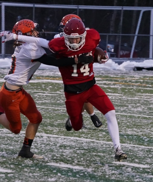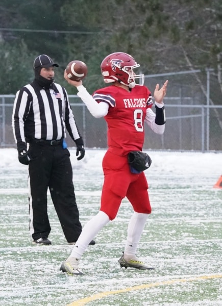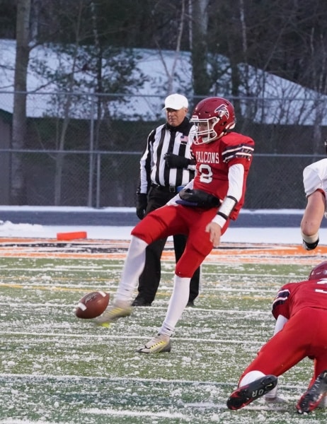 The Fertile-Beltrami Falcons football team started fast and never gave the Ogilvie Lions a chance in the opening round of the Class 9-Man State Tournament. The Falcons defense forced 5 turnovers on their way to a 22-6 win over the Lions in snow and ice on Friday night from Grand Rapids.