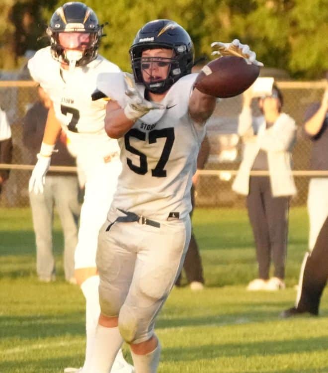 Ferto;e-Beltrami looked to answer again as they had a third down and four play when Aakhus found Drew Gullickson for a 13 yard passing play for a first down. After a one-yard run, Aakhus completed an 11-yard pass to Strem for another first down. Three plays later, Aakhus completed a 12 yard pass to Strem again. The next two plays went nine yards and on a third down play, Stephen-Argyle’s Anders Thompson, who led the team in interceptions last season, picked off a pass on the goal line and cut to the sideline and sprinted 100 yards for an interception return touchdown after a Dylan Widner two-point conversion run, the Storm led 28-8 with 2:25 left in the half.