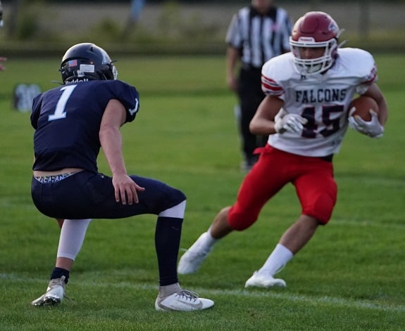 Fertile-Beltrami started the game with the ball and didn’t waste any time as they moved the ball down the field with some big plays, including an Everett Balstad nine-yard run, Rylin Petry found Balstad for an 11-yard completion, and Everett capped the seven-play drive with Balstad scoring on a 24-yard run for a 6-0 lead. “That was a good way to start the game,” said Falcon Coach Brian Nelson. “Our line did a nice job of creating some holes and that kind of set the tone for the game.” The Falcons called Balstad’s number on the two-point conversion and he pounded his way into the endzone to give Fertile-Beltrami an 8-0 lead less than three minutes into the game.