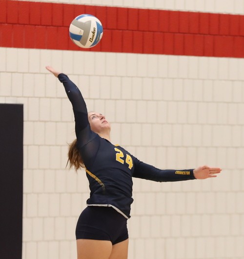 Fertile-Beltrami came out strong and took a 4-0 lead behind a kill from Marin Roragen and back-to-back aces from Aubree Swenby. The Falcons led 8-4 when they went on a 7-0 run, powered by a couple of kills by Aubree Steffes for a 14-4 lead. “We came out pretty strong, and that was nice to see,” said Falcon Coach Kerri Solie. “I thought our passing was spot on, and they were hungry and ready to go. The girls were gelling out there.” Crookston was trailing 18-9 when they went on a 6-0 run while taking advantage of five Fertile-Beltrami errors to get within an 18-15 deficit. “I was happy with how the girls responded,” said Pirate Coach Ashley Stopa. “We picked up our play, and we kept fighting.” Fertile-Beltrami recovered and was sparked by two kills from Marin Roragen. The Falcons finished the set with kills from Aubree Swenby and Aubree Steffes for a 25-19 win. “That was fun to see us hold them off,” said Falcon Coach Solie. “That was great to get the first win, and it set the tone for our girls.”
