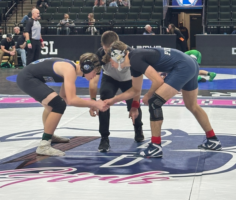 Two Crookston Pirate wrestlers are competing in the Minnesota State Individual Wrestling tournament at Grand Casino Arena in St. Paul. Mauricio Arriaga, a sophomore, is wrestling at 107 pounds in his first state tournament appearance, and Gavyn Hlucny, a senior, is wrestling in his fourth state tournament.