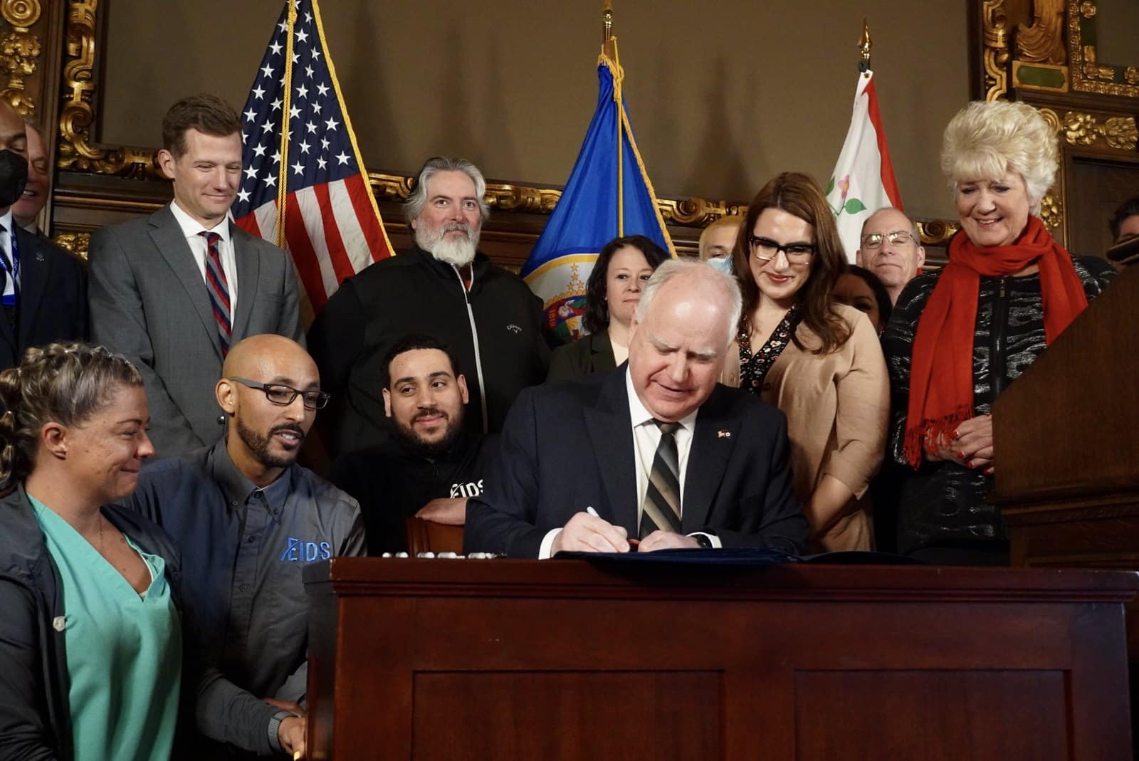 Today, Governor Tim Walz joined legislators, commissioners, small business owners, and frontline workers from across the state to celebrate the ceremonial bill signing of Chapter 50, SF 2677. This bill was signed into law Friday evening by Governor Walz and provides direct payments to frontline workers and replenishes the unemployment trust fund. Photos from the event are attached and online.
