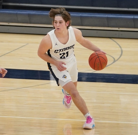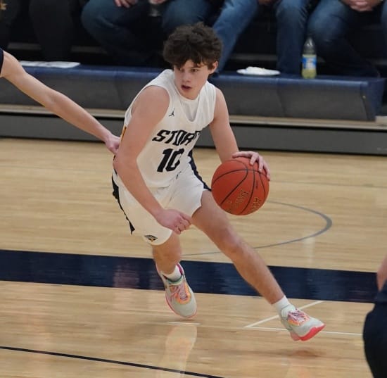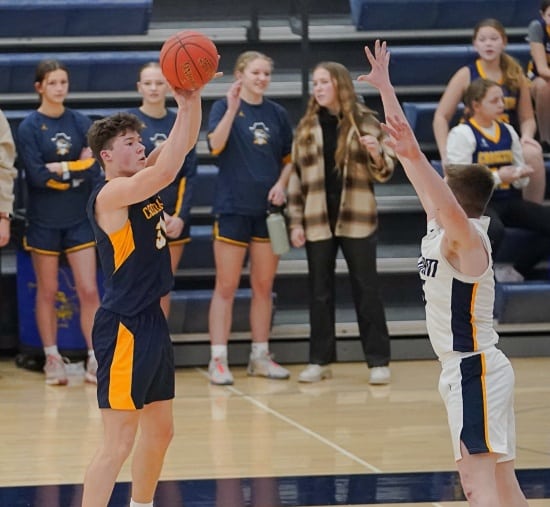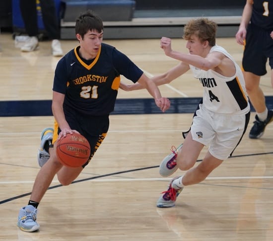 The teams battled back and forth, with four lead changes in the game’s first two minutes. With Crookston trailing 5-4, they went on an 8-0 run with Hunter Nicholas scoring all eight points for a 12-5 lead. Stephen-Argyle responded with a 7-0 run with three-pointers from Shay Setterholm and Blaine Smith, followed by Raydon Woinarowicz’s free throw to tie the game at 12-12. The game was tied again at 14 before Crookston scored six straight points, with Reggie Winjum scoring four and Tyler Michaelson adding two for a 20-14 lead with 6:22 left in the half. Stephen-Argyle responded with six straight points, Dylan Widner had four points, and Caden Pagnac added two to tie the game at 20.  The game was tied at 23 and 26 before Stephen-Argyle ended the half on a 4-0 run with baskets from Widner and Carlson for a 30-26 lead going into halftime.