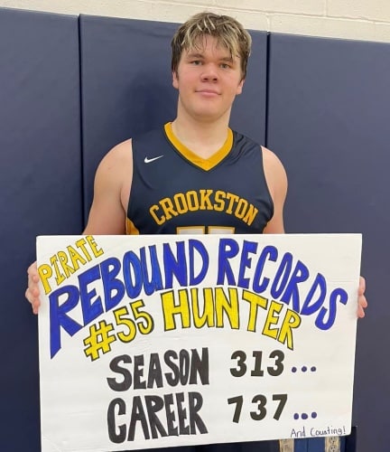The Crookston Pirate Boys Basketball team’s junior post-player, Hunter Nicholas, scored 25 points and grabbed 20 rebounds as he broke the Pirate Boys Basketball season rebounding record with his third rebound, passing Emanuel McCullough’s 312. With his 13th rebound of the game, Nicholas broke the Pirate Boys Basketball career rebound record with 737, passing Caden Osborne’s 736. Nicholas also led his team to a 58-55 victory over the Stephen-Argyle Storm 58-55 at the Crookston High School gymnasium.