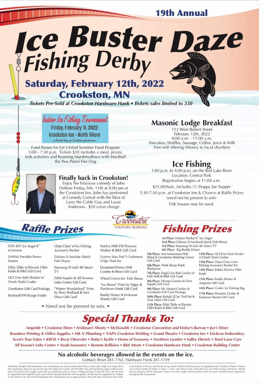 Due to Covid-19, the big Ice Buster Daze Fishing Derby held in Crookston was canceled in 2021. This year it is back and better than ever with two days of fun-filled action. The event will be held on Friday, February 11, and Saturday, February 12, with most of the action on Friday taking place inside the Crookston Inn.