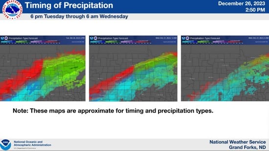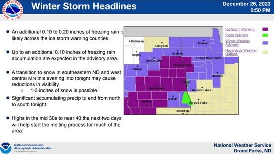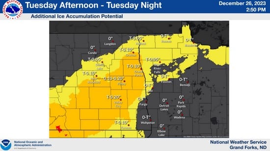 The National Weather Service in Grand Forks, North Dakota, has issued an Ice Storm Warning for West Polk County and Eastern North Dakota. The warning includes the cities of Crookston, East Grand Forks, Lakota, Mcville, Aneta, Tolna, Grand Forks, Cooperstown, Finley, Hope, Mayville, Hillsboro, Kelso, Hatton, Portland, and Roseville.