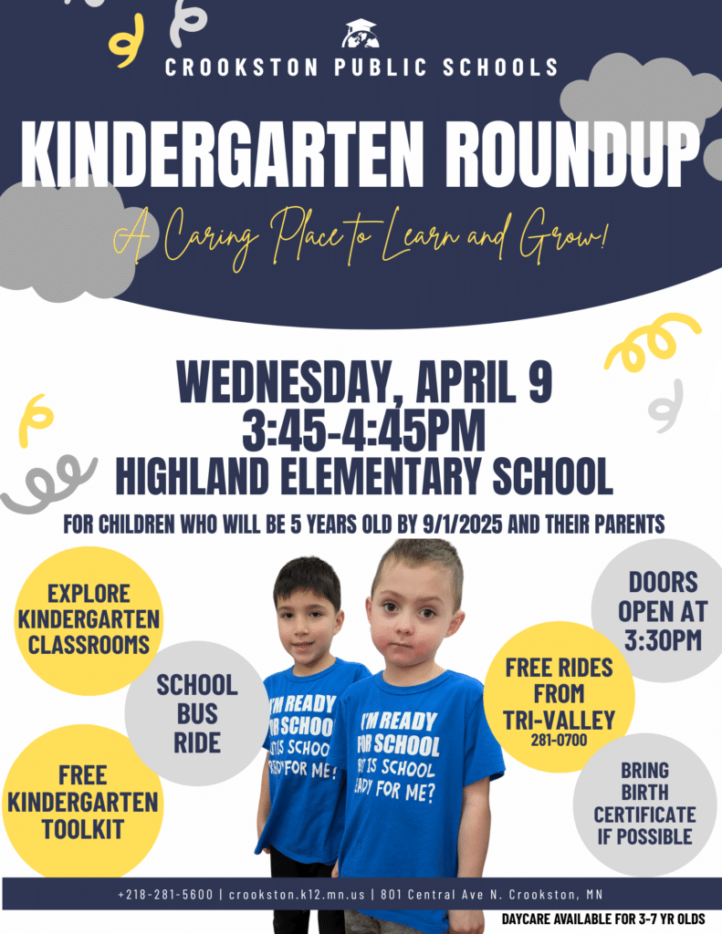 Kindergarten Round-Up is on Wednesday, April 9. Doors to Highland School open at 3:30 p.m. to start registration. If you have a child turning five years old by September 1, 2025, you are encouraged to attend. If you have any questions, please call Highland School. at 218-281-5600