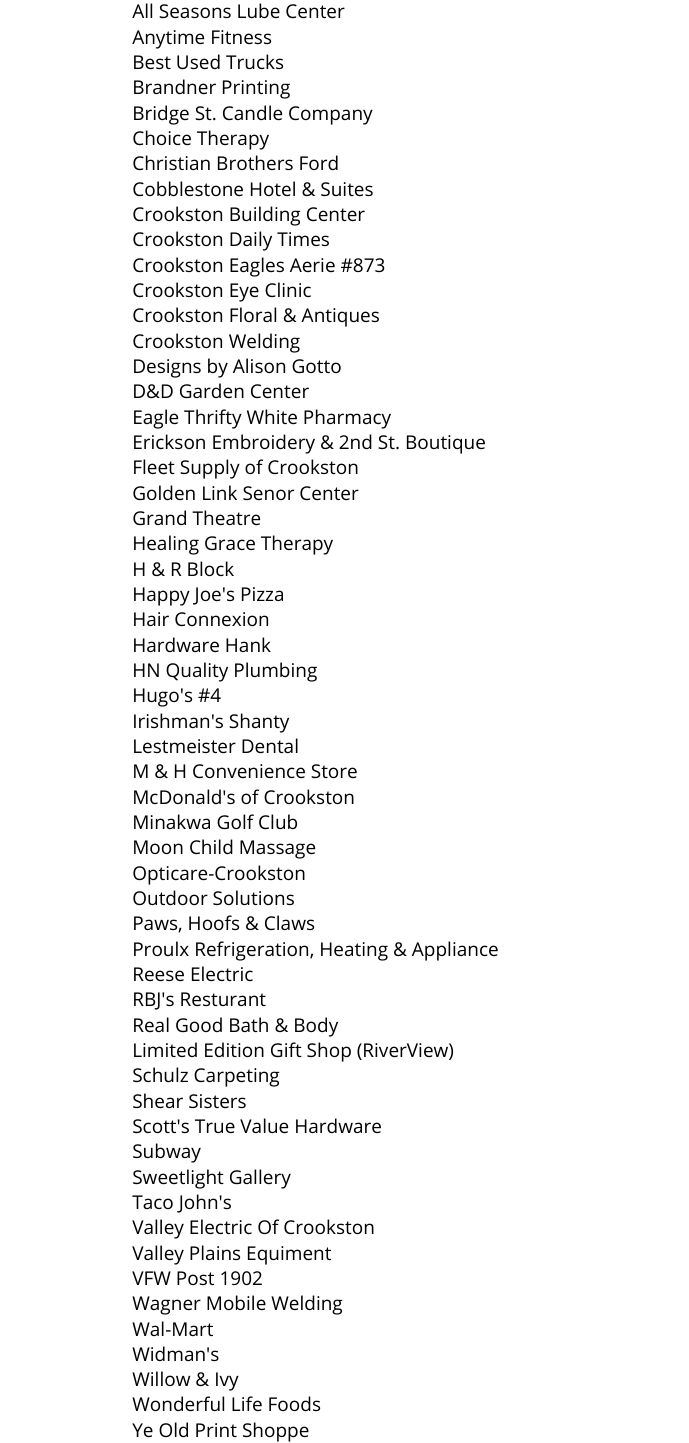 From the date “Chamber Bucks” are issued the recipient has 12 months to spend local at Chamber member businesses. This is just one of the many benefits of being a Crookston Area Chamber member. To quickly identify which businesses, accept Chamber Bucks’ look for a window cling/small semi-transparent sign on their store front with the new “Chamber Buck” logo. You may also see an updated list on our Crookston Chamber website. https://www.visitcrookston.com/ Please check periodically as business additions are made often. For quick and easy reference for your holiday shopping the most current list is included.