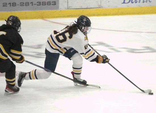 Starting the period with a power play for 4:43, Duluth Marshall would score another power-play goal, and guess who? Lindaman received another nice pass from Lian and quickly shot to beat the sliding Abrams from right to left to make it 4-1 just over two minutes into the period. The two reversed the scoring late when Lindaman found Lian on the blue line, and the tall junior defenseman blew a shot past Abrams to make the final 5-1. Crookston outshot the Hilltoppers 12-10 in the third period and 30-26 in the game. “We have things we have to clean up,” said Meyer, “we put a lot of pressure on them and their goalie. This team has what it takes; they move the puck well, see the ice, cycle, and speed. We must make sure to pick up the little things we can control. We will see Bemidji on Tuesday, and these girls want to get that revenge for when they beat us earlier this year in overtime in our rink.”