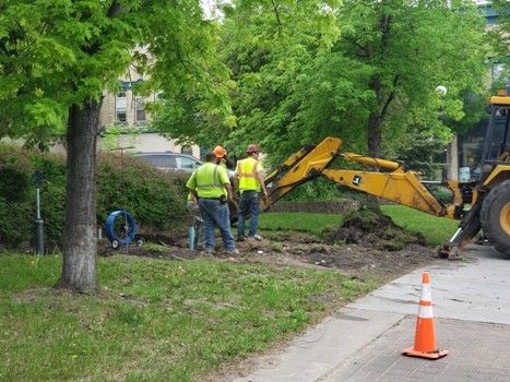 City of Crookston crews were working Tuesday on the Mayor’s Courtyard at the corner of Main and Robert streets Tuesday. They will be installing a new drinking fountain, a bench donated by the Crookston Rotary, and a bike repair station installed by Bike Crookston explains Public Works Director Pat Kelly. “I’ve got a crew over on the corner of Main and Robert,” said Kelly. “Bike Crookston and the Rotary are both involved in this. Where we took out the fountain we’re going to put a concrete slab in, there is going to be a drinking fountain installed and a Rotary bench. And then Bike Crookston is going to install a bike repair station.”