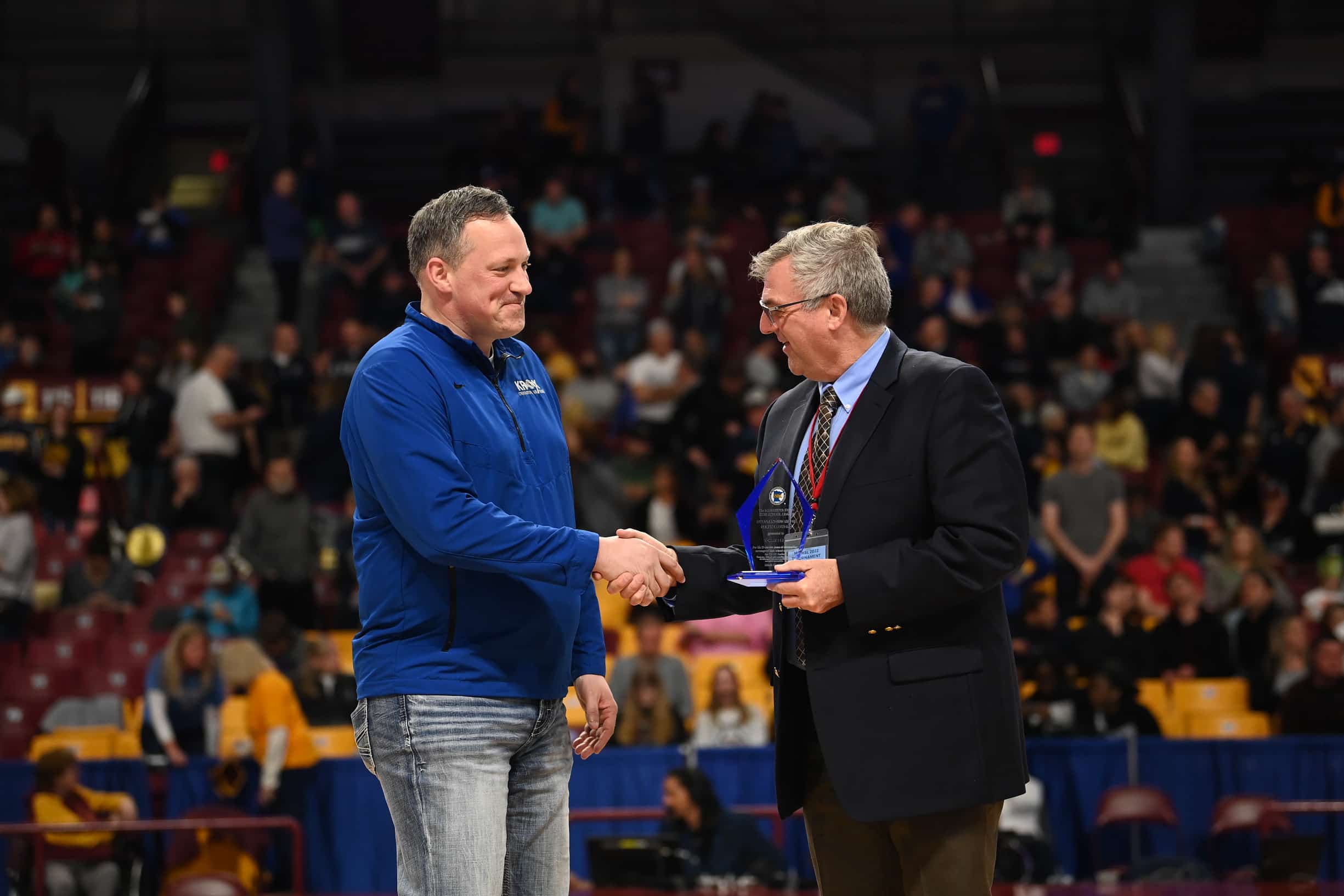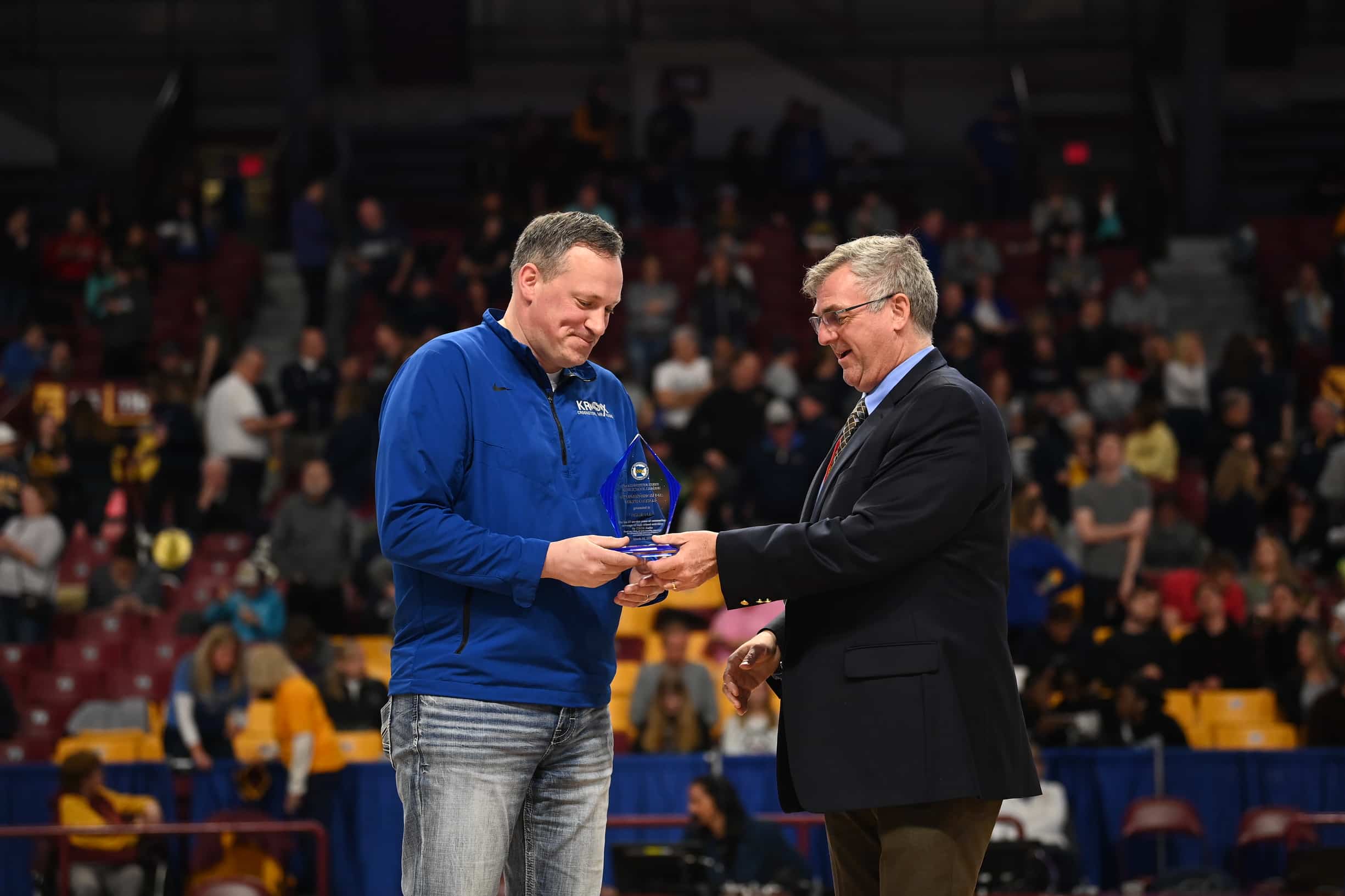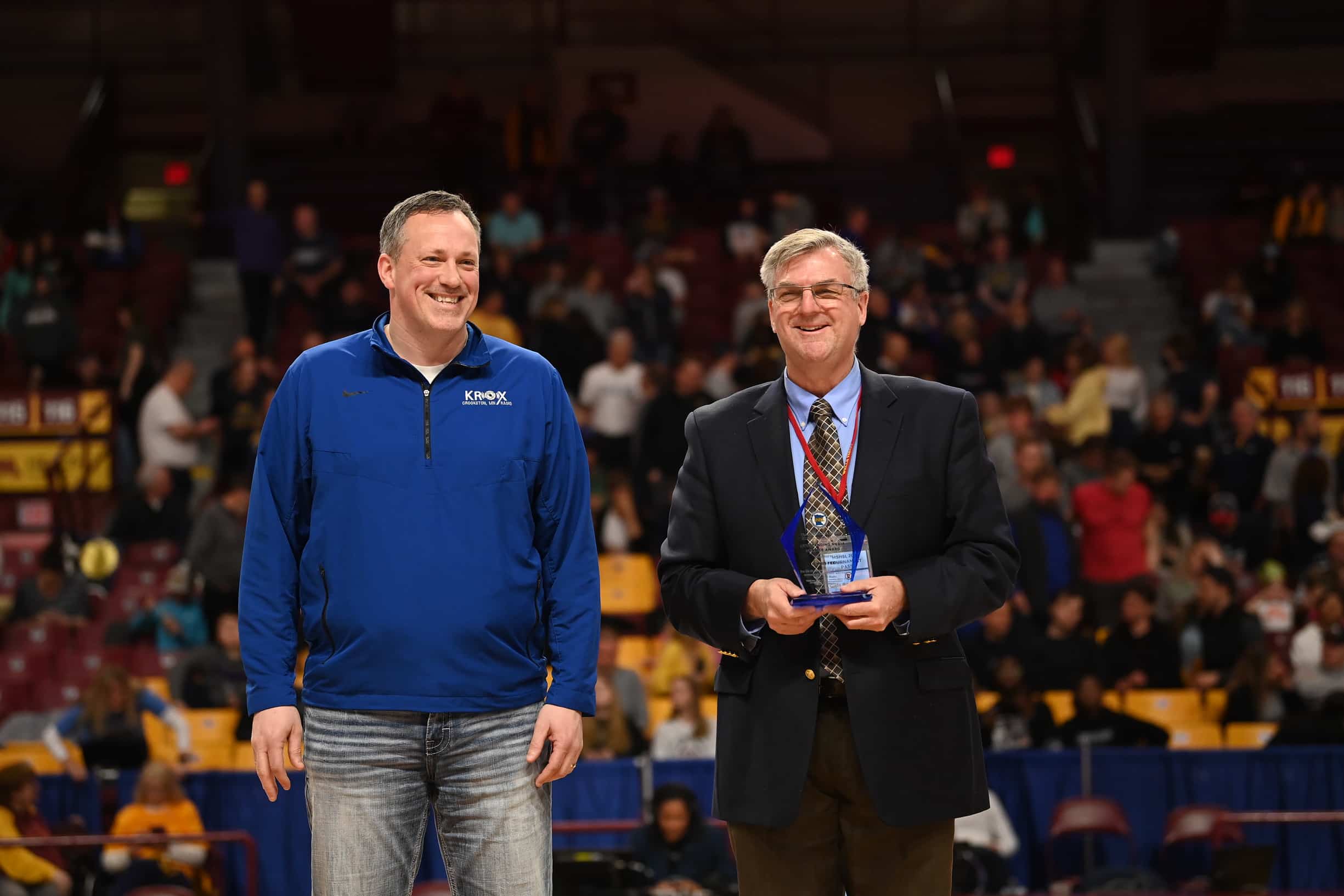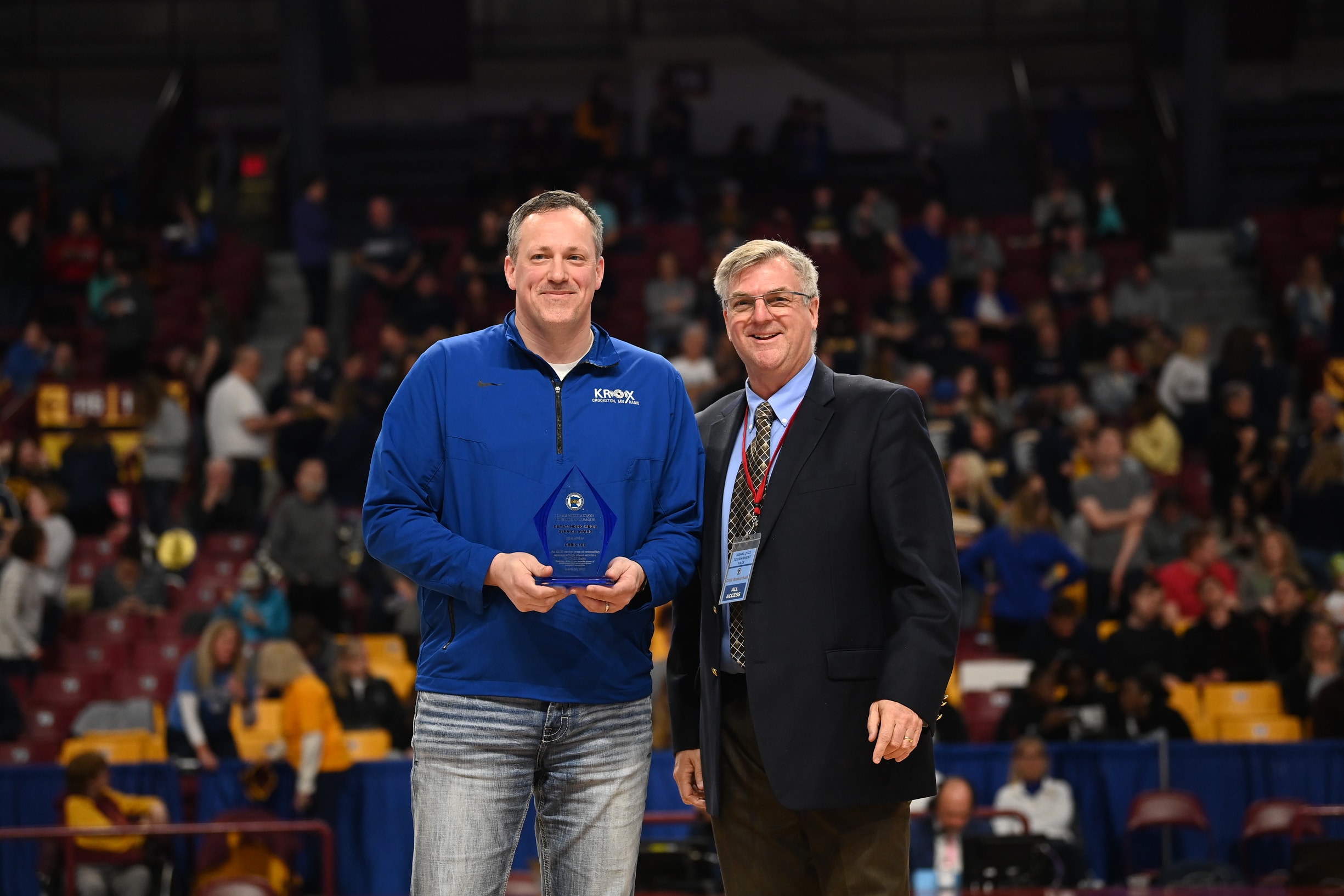 The Minnesota State High School League held an award ceremony Saturday, March 19, during halftime of the State Class AAA Girls Basketball Championship Game at William’s Arena, on the University of Minnesota campus where KROX President and General Manager Chris Fee received the Outstanding Media Service Award.