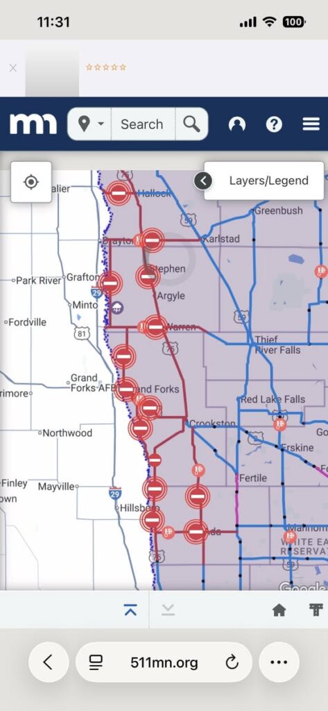 (10:45 a.m.) The Minnesota Department of Transportation has closed area highways, previously no travel advised, in northwestern Minnesota due to high winds causing blowing snow and zero visibility. The following roads are now closed: