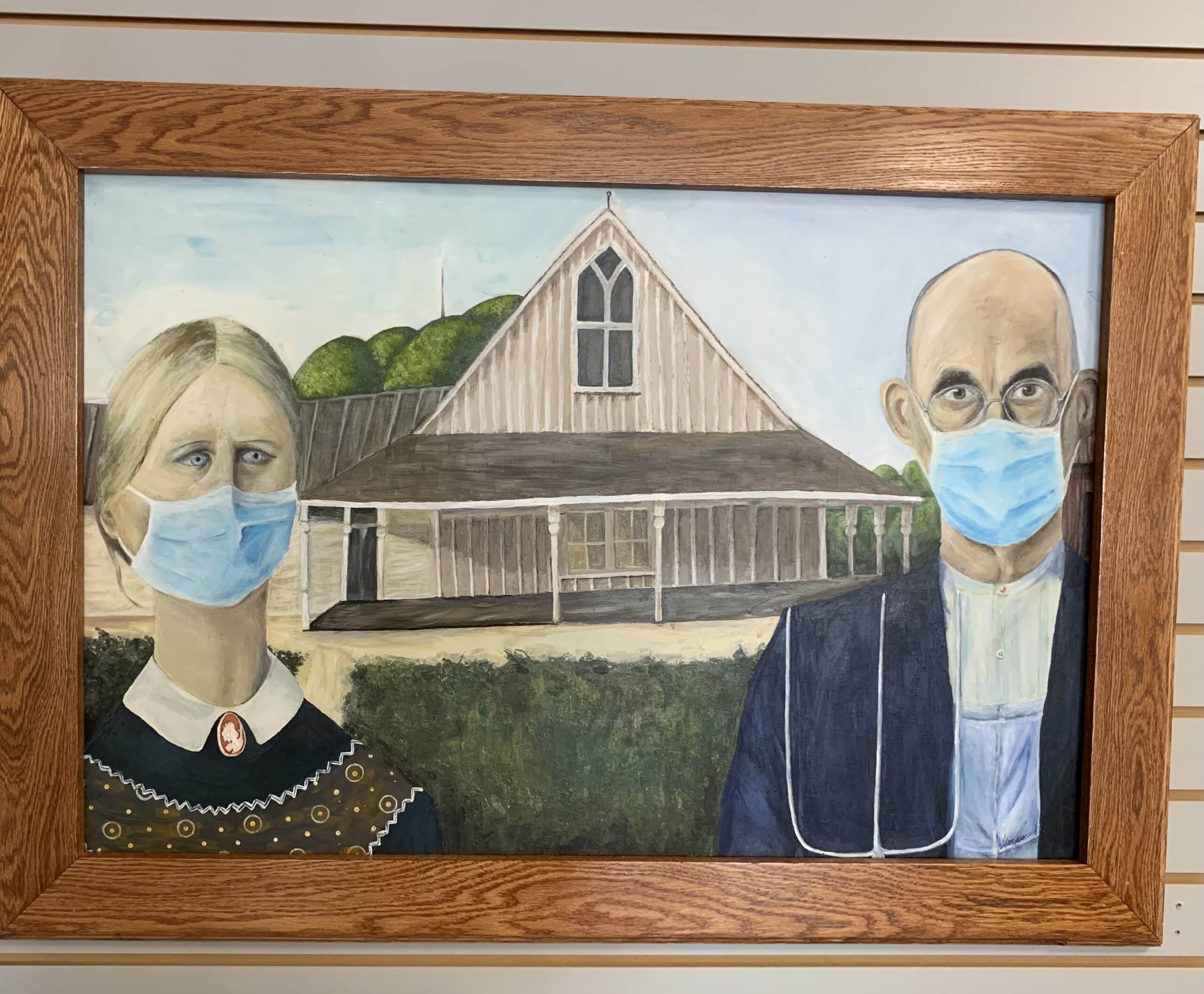 1st Place $300 – Kansas Jensen of Goodridge in acrylic painting “Covid Gothic”