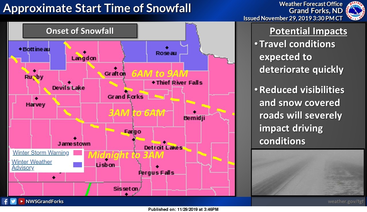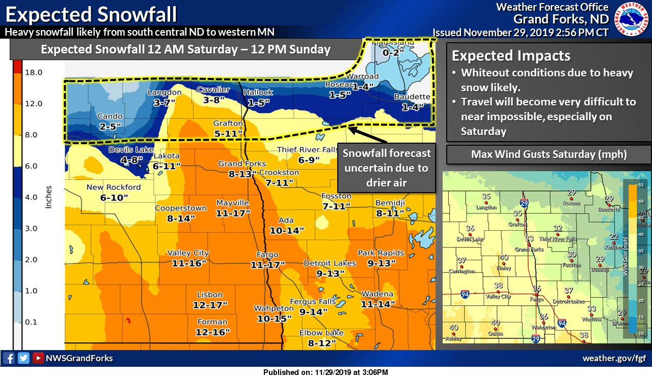 The National Weather Service in Grand Forks has issued a Winter Storm Warning for Northwest Minnesota and Eastern North Dakota, specifically along the Highway 2 corridor from 6:00 AM Saturday to Noon on Sunday.