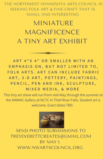 The Northwest Minnesota Arts Council (NWMAC) is pleased to announce a call for folk art and fine craft that is small and interesting for a tiny art exhibition at the Northwest Minnesota Arts Council Gallery at Northland Community and Technical College in Thief River Falls.