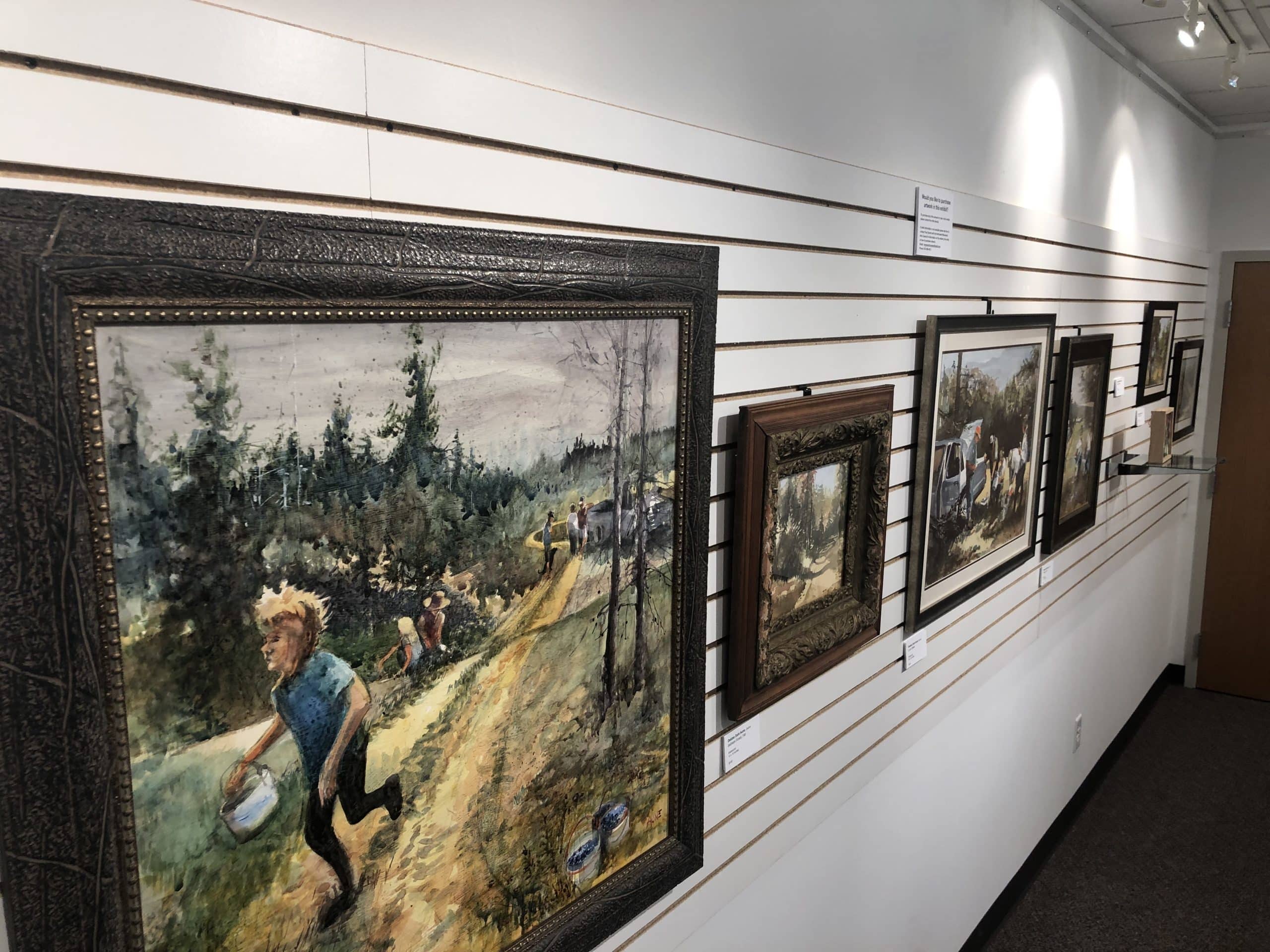Aune went on to explain that her pieces in this exhibit “consist mostly of watercolor paintings about berry picking in the Beltrami Forest with family and friends. Several paintings were initiated on-site and then finished in my studio. My uncle Melvin Hesse, Aunt Peggy, and friend Betty Amiot are the senior members of our berry picking family. My Mom, Dad, and Uncle Raymond aren’t far behind when there’s talk of a blueberry picnic. Several other family members can be found sprinkled about my blueberry compositions. Bring on the bug spray, hats, and pickles. And dear Lord, I hope there are blueberries this year!”
