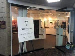 The 35 pieces in this exhibit include oil and acrylic paintings, ceramic art, and pen and ink and depict the nuances and breadth of spirituality. Showcase Specialist Trey Everett explained, “I am thrilled with our newest exhibit “Art and Spirituality.” It is difficult to convey in words and sentences what spirituality is to us, let alone our personal spiritual experiences. However, art, in any form, can express the transcendent. The artwork in this exhibit is highly varied and a very intimate expression of spirituality to each artist. Sister Denise’s hypnotic and prophetic artwork gave the whole gallery a surreal orange-red tint when it was installed. The religious philosopher Rudolf Otto coined the word Numinous from the Latin numen, meaning a “divine majesty” or “presiding spirit.” He believed “that the essence of holiness was to invoke a feeling of awe, wonder, and even dread in the observer.” He called this the “Numinous.” I hope when people interact with this exhibit, they experience the numinous, a sense of peace and awe and a sense of unease and challenge.”