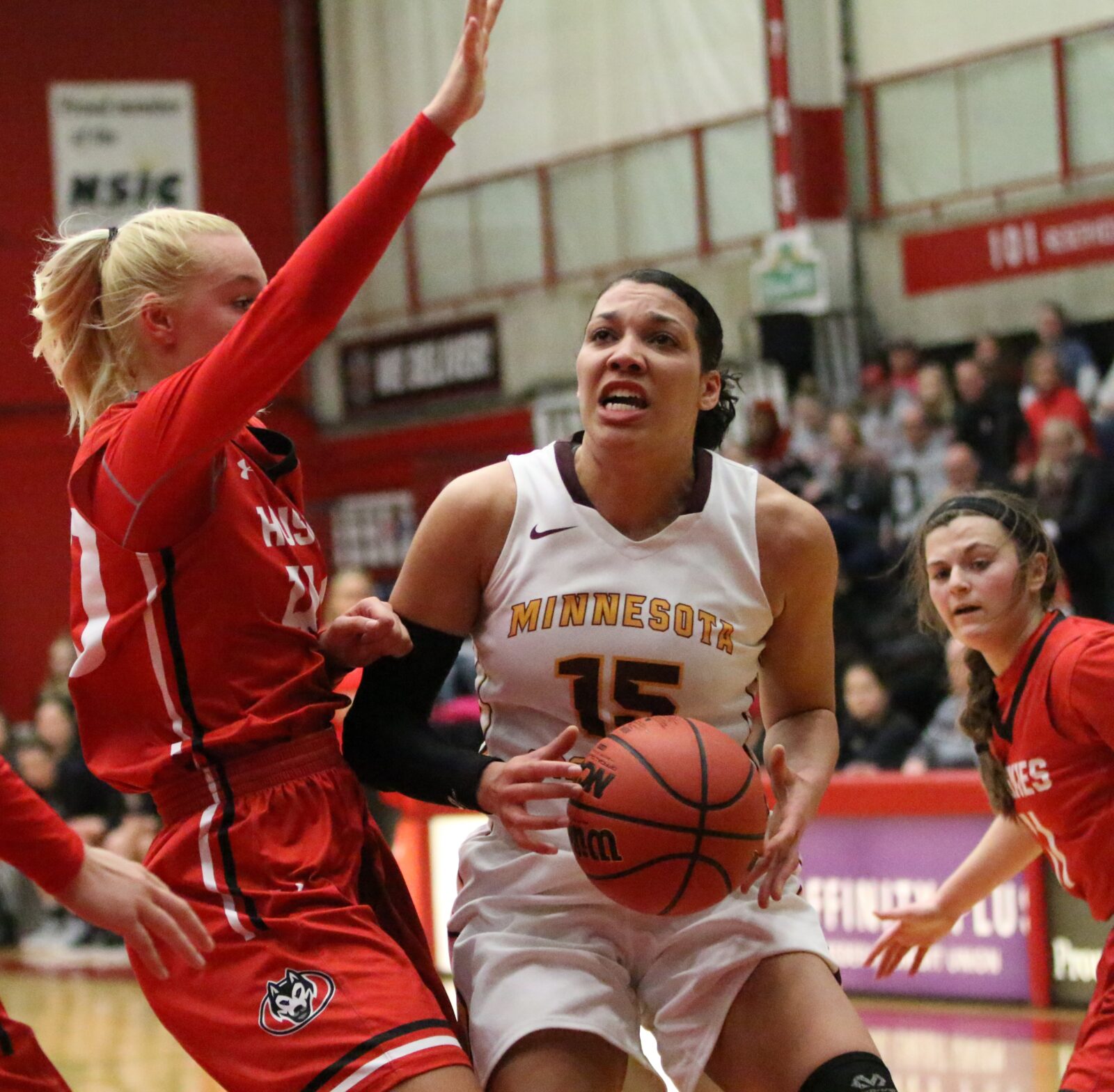 St. Cloud State used two jump shots in the first minute of the fourth quarter expanding their lead to 63-50. Isieoma Odor answered with four straight points pulling Minnesota Crookston within 63-54 with 7:41 to play. Paige Cornale buried a three-pointer with 5:53 to play cut UMC’s deficit down to seven with a 3-0 run with 1:54 to play bringing the Golden Eagles within 67-61. St. Cloud State was perfect from the free-throw line during the final minute preventing a late rally from Minnesota Crookston as the Huskies closed out a 77-68 win. “Second chance points was the difference in the ball game,” summarized Roysland after SCSU scored 19 second-chance points off of 17 offensive rebounds. “It was a different person each particular time and that’s just hustle points. St. Cloud did a better job than we did. Maybe it was our youth out there at times but doesn’t matter at this point in the year. It’s just really hard to recover from second-chance points. You’ve just got to credit St. Cloud for their effort.”
