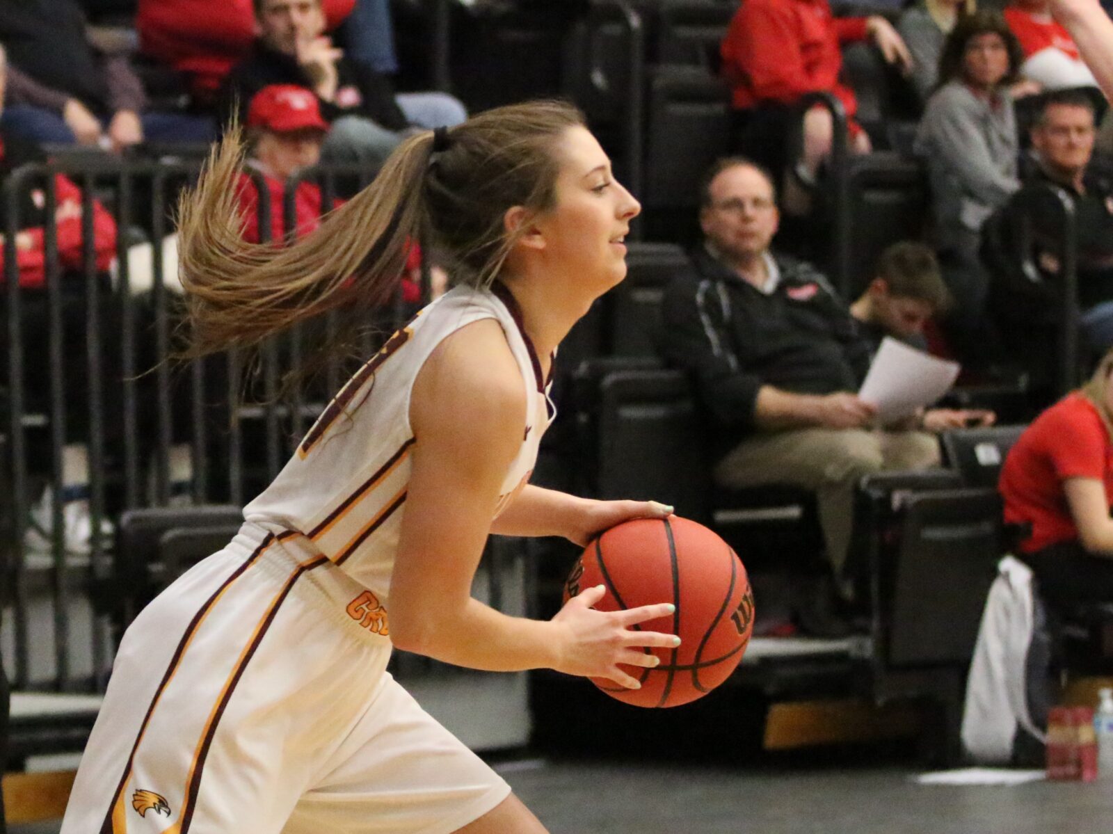 The two teams traded baskets to open the second quarter before Isieoma Odor knocked down a corner three-pointer giving UMC a 24-18 lead with 6:13 to play in the first half. St. Cloud State answered with an 11-0 run to take a 29-24 lead before Bren Fox made her first three-point attempt of the season from the top of the key cutting UMC’s deficit down to 29-27. Paige Weakley (Jr., Kearney, MO) made a three-pointer trimming SCSU’s lead down to one, with another three-pointer from Weakley with 48-seconds to play in the second quarter giving Minnesota Crookston a 35-33 lead. Bren Fox made a jump shot to close the first half giving the Golden Eagles a 37-35 halftime lead. “We kind of had (the offense) going inside out,” explained UMC head coach Mike Roysland. “Kylie Post was making some really nice decisions. It all stems with needing a guard to attack the rim like that and make a decision with it. She found shooters and shooters made shots. Obviously, Bren played well. She made that shot at the top of the key which I think gave her a lot of confidence.”