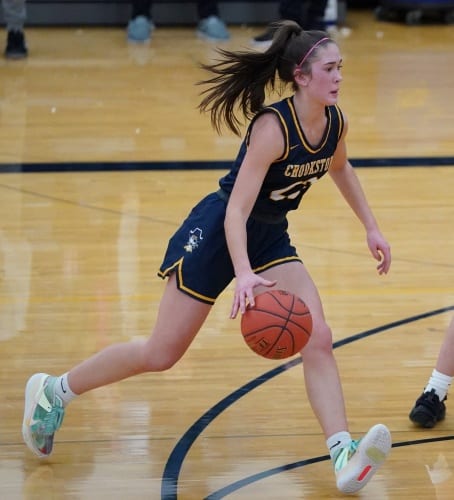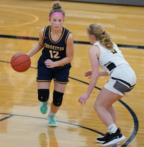 Perham started the scoring with a Sydney Anderson three-pointer for a 3-0 lead 24 seconds ino the game. Crookston responded with a 6-0 run with baskets from Abby Borowicz with an offensive rebound and putback, a Halle Winjum drive for a basket, and a steal and basket for Hayden Winjum for a 6-3 lead three minutes into the game. “It was a strong start for us,” said Coach Zimmerman. “We had some strong passing and it was a good fundamental start for us.”