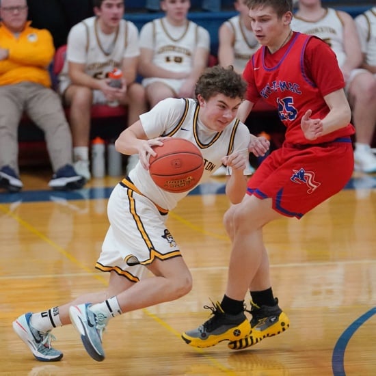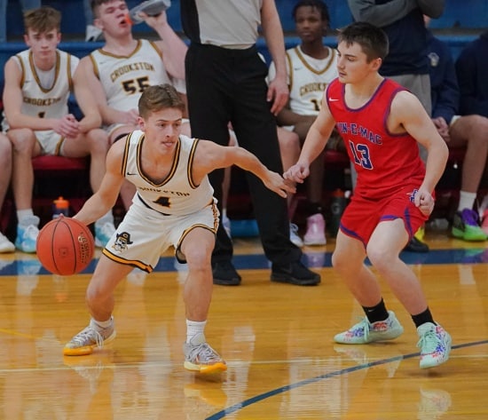 Crookston’s Hunter Nicholas scored the first two points of the game on a pair of free throws before Win-E-Mac responded with a 12-1 run for a 12-3 lead three minutes into the game. Crookston’s Jack Everett stopped the run with a three-pointer, but Win-E-Mac continued to build on their lead and took a 20-8 lead five minutes into the game. Crookston stopped the run and got right back into the game with three straight three-pointers, with Tyler Michaelson, Everett, and Nicholas hitting the long-range shots to get within a 20-17 deficit with 11:15 left.