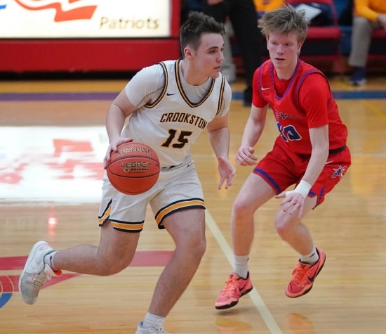 Win-E-Mac, as they would all game long, had an answer with a Justin Courtney three-pointer. A few minutes later, Win-E-Mac led 26-21 when Crookston’s Winjum scored on a nice drive, and Isaac Thomforde followed with a three-pointer to tie the game at 26 with seven minutes left in the half. Win-E-Mac took advantage of Crookston taking Nicholas out of the game after he picked up his second foul, and the Patriots finished the half with a 49-42 lead.
