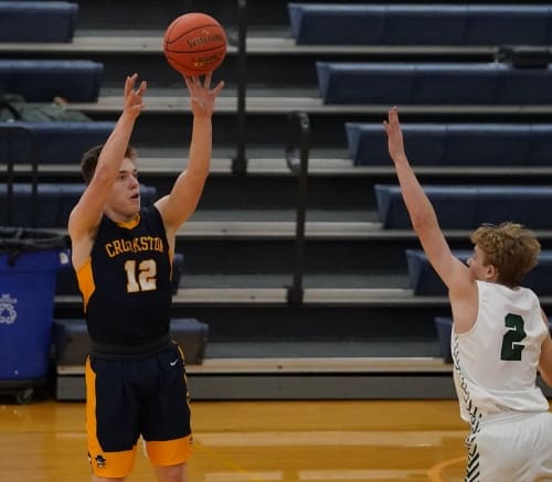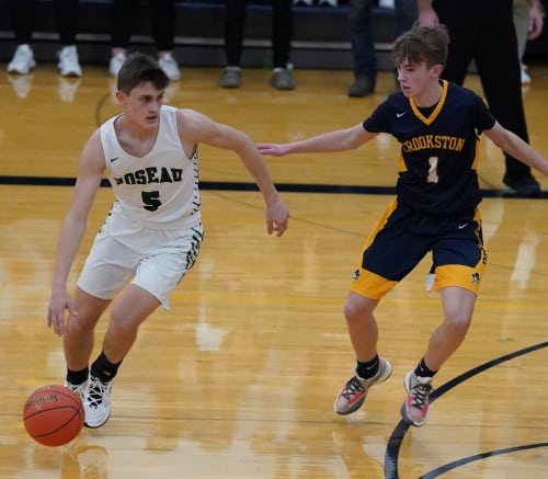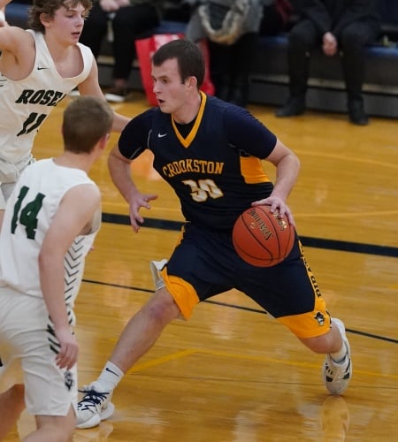 Crookston had a great start to the game by going on a 5-0 run with a steal and a basket from Hunter Nicholas, a free throw from Jack Garmen, and a basket by Jacob Hesby to start the game. Roseau finally scored their first points of the game when Gunnar Lund got a nice pass from Jordan Borowicz for a layup to get within a 5-2 deficit with 13:34 left in the half.