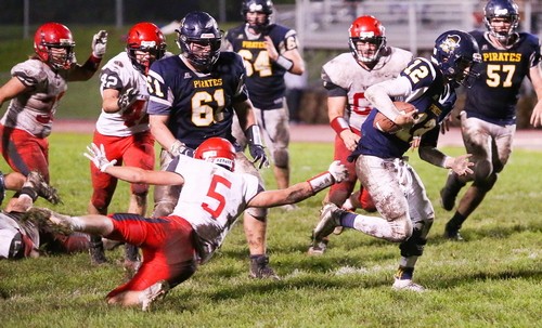Crookston’s defense came out strong with a Zach Brown interception on the second play of the game to give the Pirates the ball at the West Central Area 36-yard line. “Zach made a great play there,” said Crookston Pirate Coach Scott Butt. “Zach read it well and made a nice play.” The first play of the drive was a six-yard pass from Leyton Salentine to Ethan Boll. After a one-yard loss, Crookston got a first down on a West Central Area penalty. On the next play, Salentine scampered 27 yards into the endzone to give Crookston a 6-0 lead after the Pirates missed the extra point kick. “Leyton was wide open and he is looking more and more comfortable each week,” said Coach Butt. “He had a really nice game for us tonight and that was great to see.”